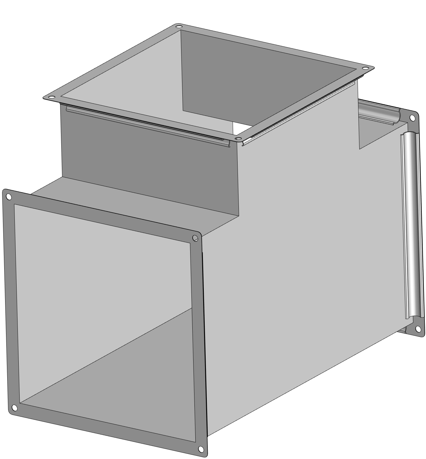 Прямоугольные тройники - фассоная часть из оцинкованной стали , используемая для разветвления вентиляционной системы с прямоугольным сечением.